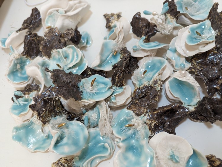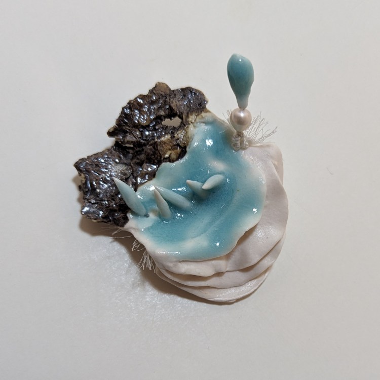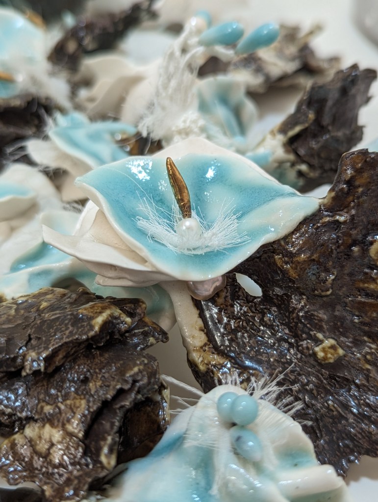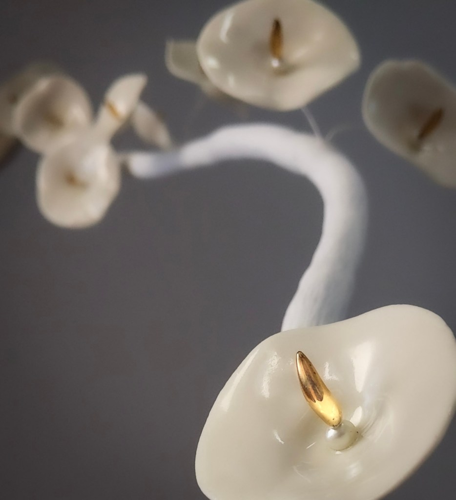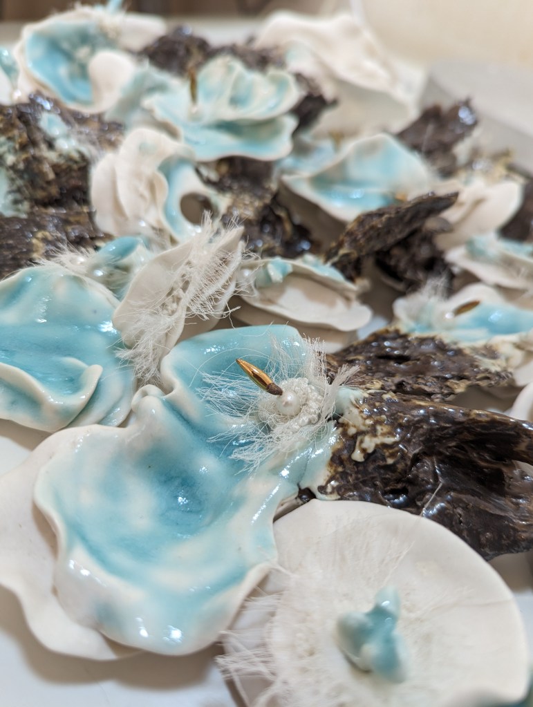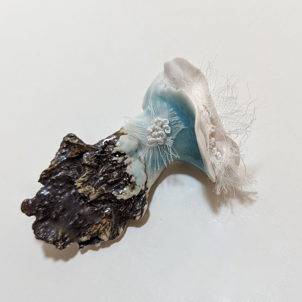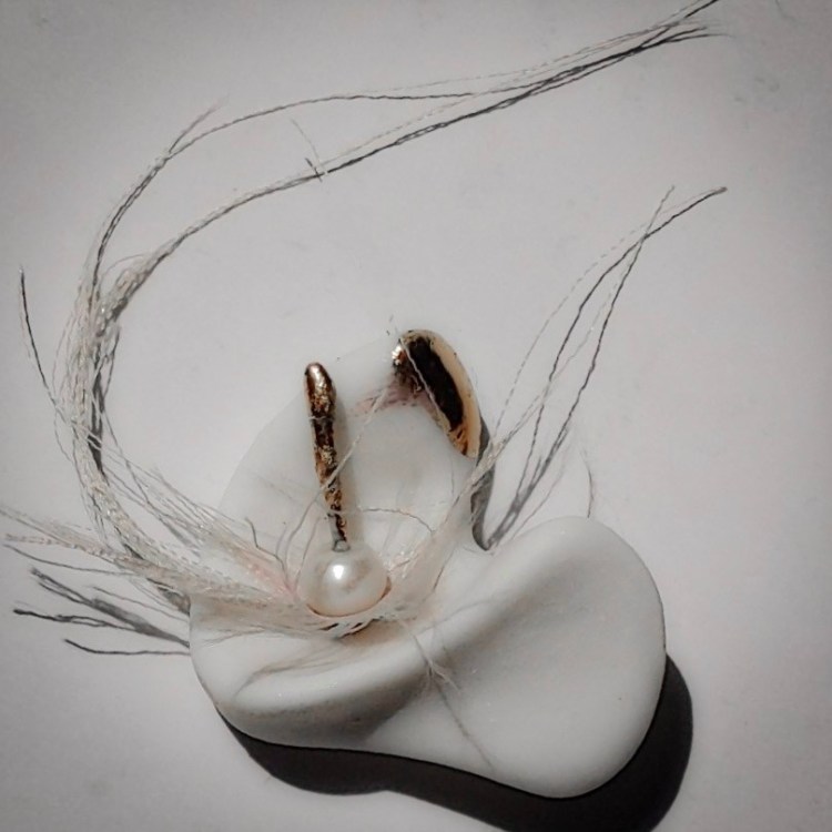 A collection of small sculptural objects made in residency in Rome where they were featured in a group show at C.R.E.T.A. Rome: “Ritualia.” The sculptures were made in a layering process over three weeks with paper porcelain and a final embellishment of embroidery, pearls, and gold lustre. In a surprise turn of focus in this seven-week residency, the sculptural work I had intended yielded to a much deeper process.
